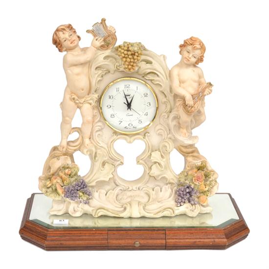 A COMPOSITE FRAMED FIGURAL MANTEL CLOCK WITH A MIRRORED BASE