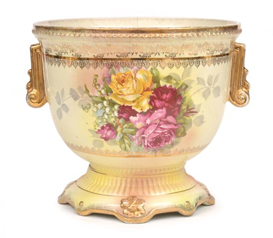 AN EDWARDIAN FLORAL DECORATED JARDINERE (HAIRLINE CRACKS)