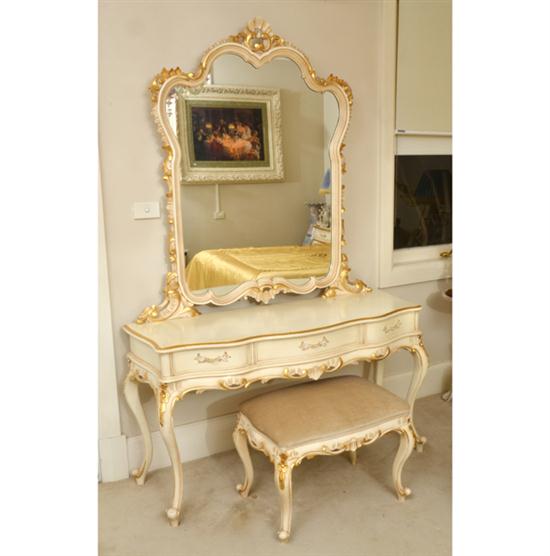 A PAINTED AND GILT CABRIOLE LEG MIRROR BACK DRESSING TABLE WITH A MATCHING MIRROR AND STOOL