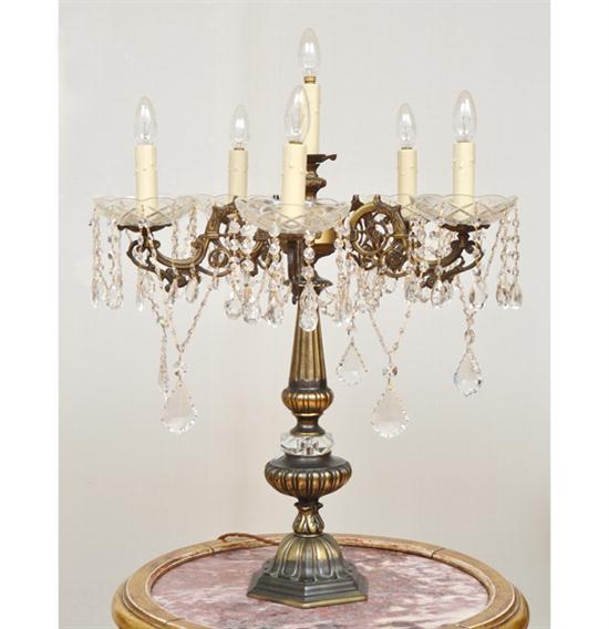 AN ELECTRIFIED CRYSTAL AND BRASS FIVE BRANCH CHANDELIER