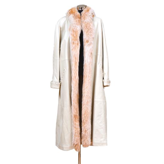 A FULL LENGTH IVORY LEATHER AND FOX FUR TRIM COAT