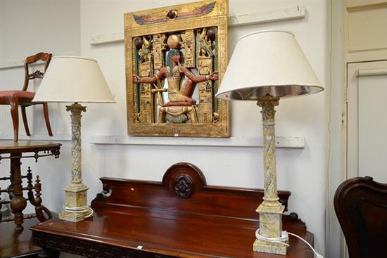 A SUBSTANTIAL PAIR OF VARIGATED MARBLE COLUMNAR LAMPS WITH SHADES