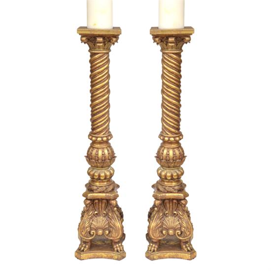 A PAIR OF GILT WOOD COLUMNAR TORCHERES