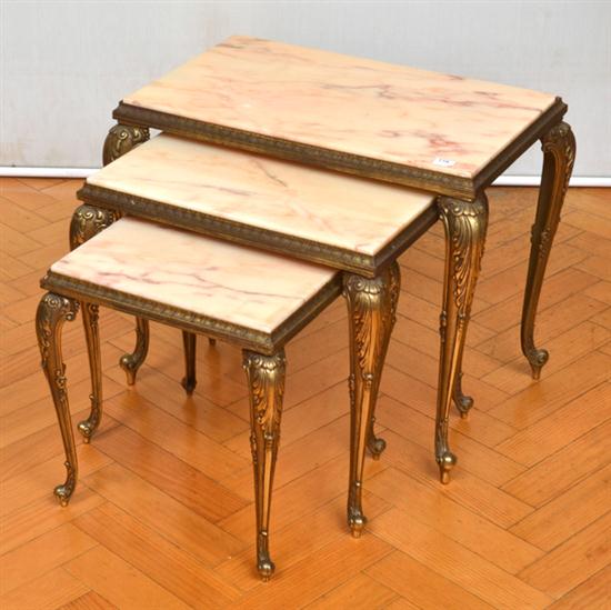 A NEST OF THREE GILT METAL BASED RECTANGULAR SIDE TABLE WITH A ONYX INSET TOPS