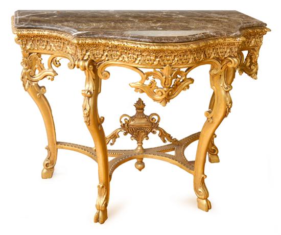 A LOUIS XV STYLE MARBLE TOP GILT WOOD FRAMED CONSOLE