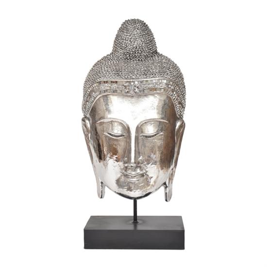 A SILVERED WOODEN MASK OF A BODHISATTVA ON A WOODEN PLINTH