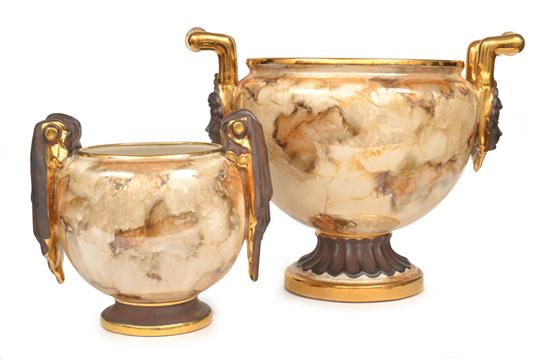 TWO SPANISH PAINTED AND IRIDESCENT GLAZED JARDINIERES