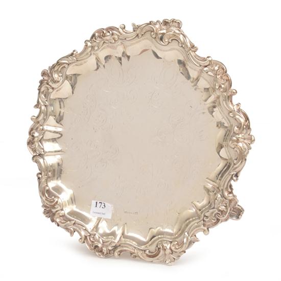 A VICTORIAN SHEFFIELD PLATE SALVER, MAKER'S MARK JOSEPH & ALBERT SAVORY, SHEFFIELD CIRCA 1855 WITH A FOLIATE CAST BORDER AND THREE FEET, ONE FOOT RESTORED, 26CM WIDE