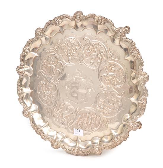 A WILLIAM IV STERLING SILVER SALVER, MAKER'S MARK I.E.T, LONDON CIRCA 1830, CIRCULAR WITH A SCALLOPED EDGE AND CAST AND EMBOSSED FOLIATE DECORATION