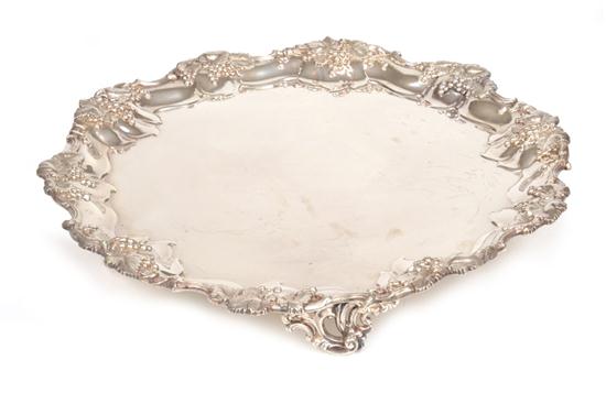 A GEORGE V STERLING SILVER SALVER, MAKER'S MARK JAMES DICKSON & SON, SHEFFIELD CIRCA 1911, WITH A SCALLOPED GRAPE AND VINE CAST BORDER AND FOUR PIERCED FEET