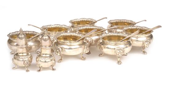 A SET OF EIGHT EDWARD VII STERLING SILVER SALT CELLARS, MAKER'S MARK PIERCE & SONS LTD, LONDON 1908 WITH EIGHT STERLING SILVER SALT SPOONS MAKER'S MARK C.S HARRIS & SONS LTD, LONDON 1908 AND TWO LIDDED SALT CELLARS, MAKER'S MARK MR, LONDON 1906