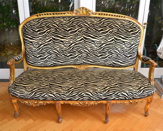 A LOUIS XV STYLE GILT WOOD FRAMED SETTEE WITH FAUX ZEBRA STRIPE UPHOLSTERY
