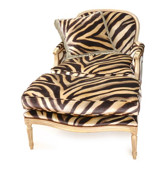 A LOUIS XVI STYLE BERGERE AND OTTOMAN WITH FAUX ZEBRA STRIPE UPHOLSTERY
