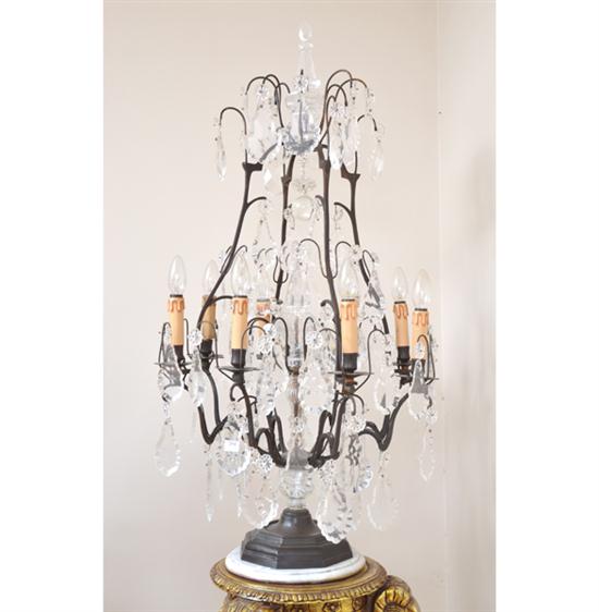 A PAIR OF WROUGHT IRON FRAMED CANDELABRA HUNG WITH CRYSTAL LUSTRES