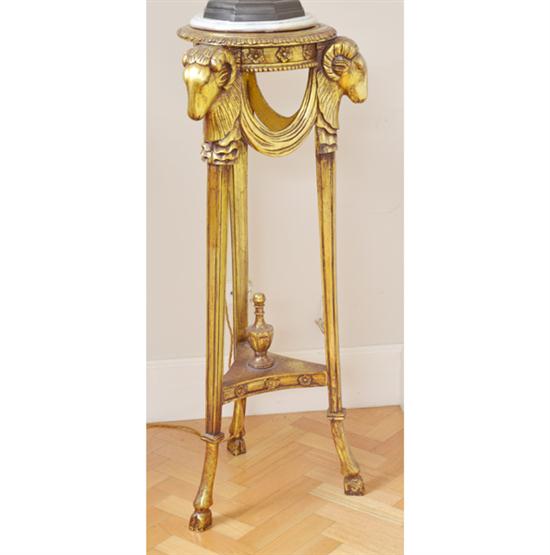 A PAIR OF FRENCH EMPIRE STYLE GILT WOOD FRAMED MARBLE TOPPED PEDESTALS 33CM DIAMETER X 112CM HIGH