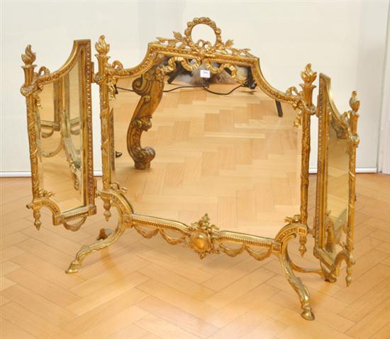 A FRENCH EMPIRE STYLE MIRRORED GILT METAL FRAMED THREE PANEL FIRE SCREEN