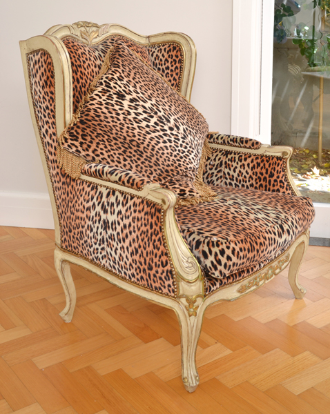 A PAIR OF SEMI WING BACK PAINTED AND GILT ARMCHAIRS WITH FAUX LEOPARD SKIN UPHOLSTERY