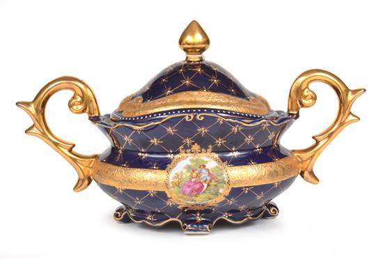 A LIMOGES COBALT BLUE AND GILT PORCELAIN TWO HANDLED TUREEN AND COVER