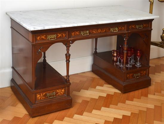 A MARBLE TOP MAHOGANY AND MARQUETRY WASH STAND