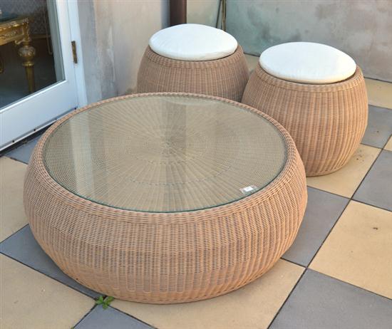 A THREE PIECE CANE OUTDOOR SETTING INCLUDING A CIRCULAR LOW TABLE AND TWO SEATS