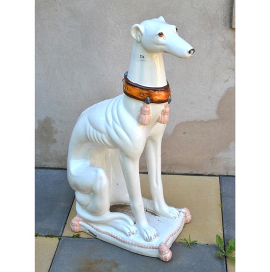 A GLAZED CERAMIC FIGURE OF A WHIPPET (REPAIRED)