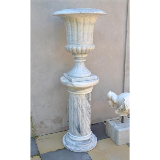 A CLASSICAL STYLE FLUTED MARBLE URN ON A COLUMNAR MARBLE PEDESTAL