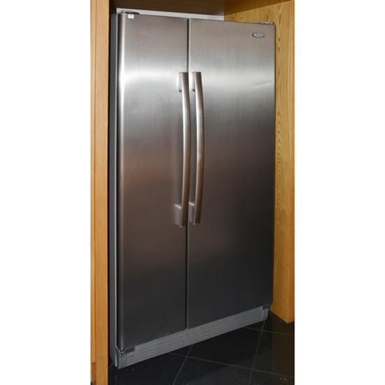 A WHIRLPOOL BRUSHED ALUMINIUM FRONTED TWO DOOR REFRIDGERATER (SMALL DENT TO RIGHT DOOR)