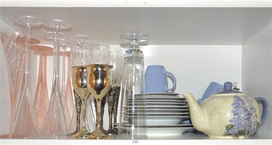 A COLLECTION OF CERAMIC PLATES, GLASS STEM WARE AND A TEAPOT