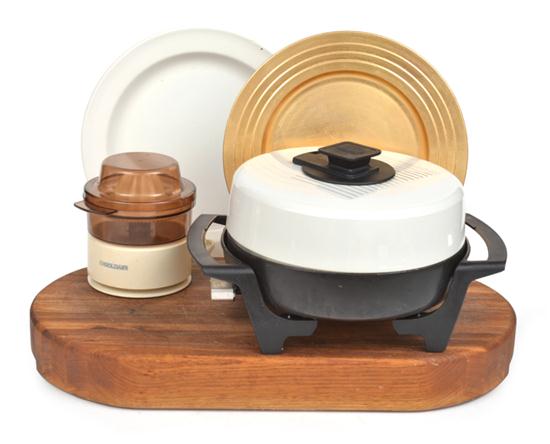 A GROUP OF CERAMIC PLATTERS AND KITCHEN APPLIANCES INCLUDING GOLDAIR LEMON JUICER, TABLE TOP GRILL, ELECTRIC FRYPAN AND A WOODEN CHOPPING BOARD