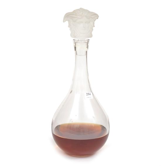 A VERSACE FROSTED AND CLEAR GLASS DECANTER, (CHIP TO ONE CORNER OF STOPPER)