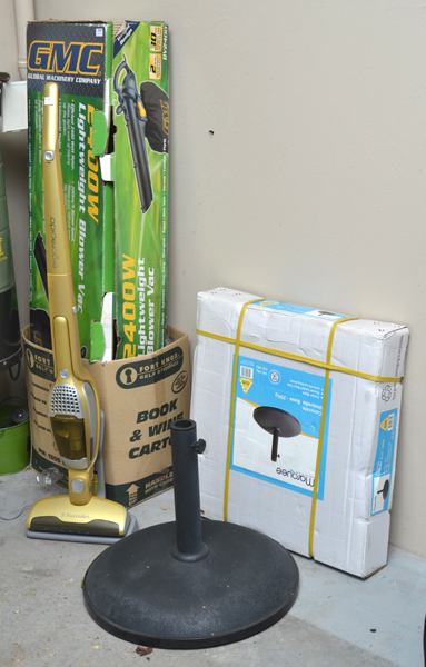 AN ELECTROLUX CORDLESS VACUUM, TOGETHER WITH A GMC BLOWER VAC AND TWO OUTDOOR UMBRELLA BASES