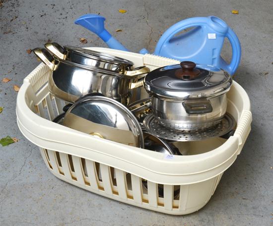 A COLLECTION OF HOUSEHOLD ITEMS INCLUDING KITCHENWARE, PLASTIC BASKETS AND A WATERING CAN