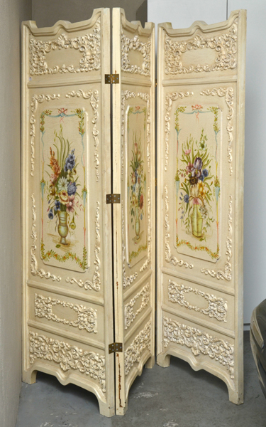 *** WITHDRAWN *** A DECORATIVE THREE PANEL SCREEN WITH PAINTED AND CARVED DECORATION, 180 X 180CM