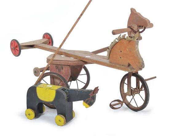 CHILDS TRICYCLE, ONE PEDAL MISSING AND THREE WOODEN PULL ALONG TOYS, LARGEST 96CM LONG (4)