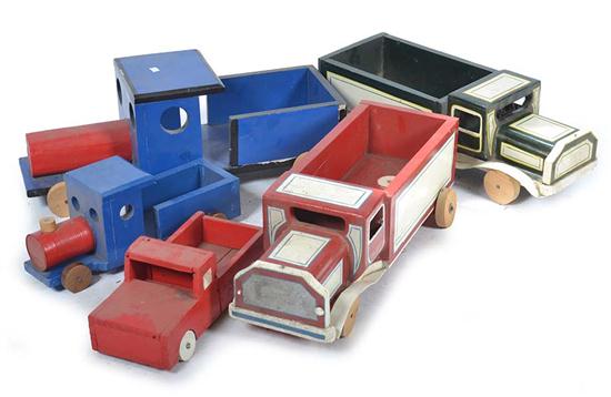 FIVE LARGE SCALE HAND MADE DEPRESSION STYLE PAINTED WOODEN TOY VEHICLES, LARGEST 66CM LONG (5)