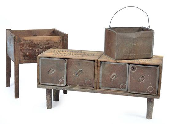 DEPRESSION STYLE SIDE BOARD AND ANOTHER SIMILAR, CONSTRUCTED FROM WHITE ROSE OIL CRATES, LARGEST 48CM HIGH X 105CM WIDE X 37CM DEEP (2)