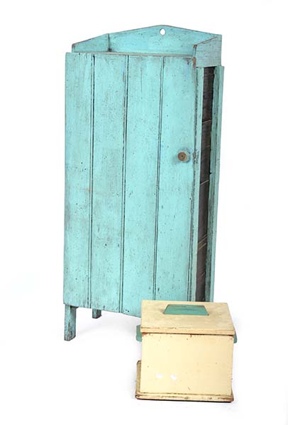 RUSTIC WOODEN AQUA PAINTED CUPBOARD AND RUSTIC WOODEN CREAM PAINTED LIDDED BOX (2)
