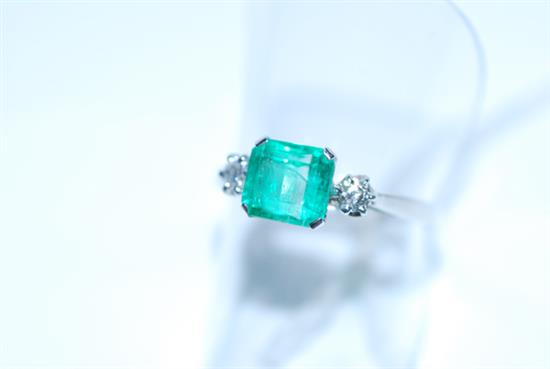 AN EMERALD AND DIAMOND RING IN 18CT WHITE GOLD