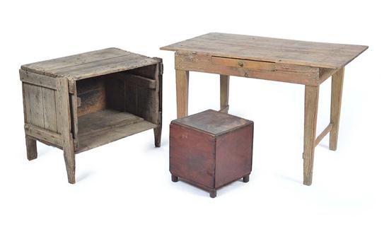 RUSTIC DINING TABLE WITH DRAWER AND CABINET; AND TWO OTHERS, TABLE 70CM HIGH X 115CM WIDE X 78CM DEEP