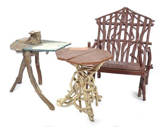 THREE FURNITURE PIECES CONSTRUCTED FROM TREE BRANCHES INCLUDING TWO TABLES; AND ONE CHAIR, LARGEST 99CM HIGH X 73CM WIDE X 80CM DEEP (3)