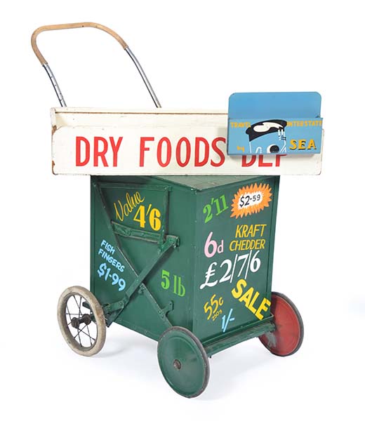 GREEN WOODEN REFRIGERATOR TROLLEY ADVERTISING FISH FINGERS AND KRAFT CHEDDER EXHIBITED IN 'THE GREAT EXHIBITION' 1983-84, MUSEUM OF VICTORIA CURATED BY MURRAY WALKER; AND TWO OTHERS, TROLLEY 93CM HIGH X 77CM WIDE X 31CM DEEP (3)