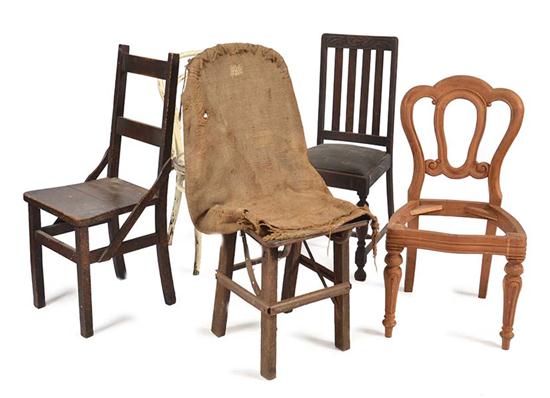 CEDAR PIONEER CHAIR, CIRCA 1930S; CONVERTED TRUCK SEAT, CIRCA 1930S; AND THREE CHAIRS, VARIOUS SHAPES, SIZES AND COLOURS (5)