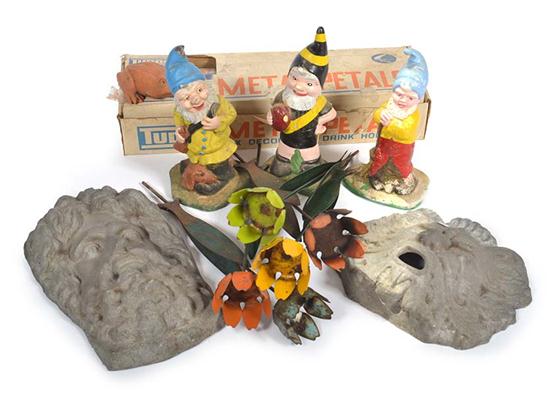 THREE GARDEN GNOMES; TWENTY THREE ORNAMENTAL METAL TULIP DRINK HOLDERS; AND OTHER GARDEN ORNAMENTS (A LOT)