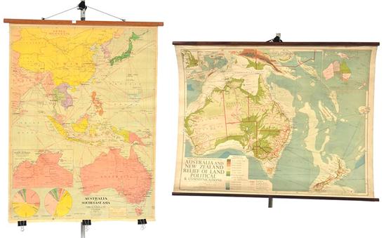 TWO EDUCATIONAL HANGING MAPS INCLUDING AUSTRALIA AND SOUTH-EAST ASIA; AND AUSTRALIA AND NEW ZEALAND, LARGEST 115CM HIGH X 88CM WIDE (2)