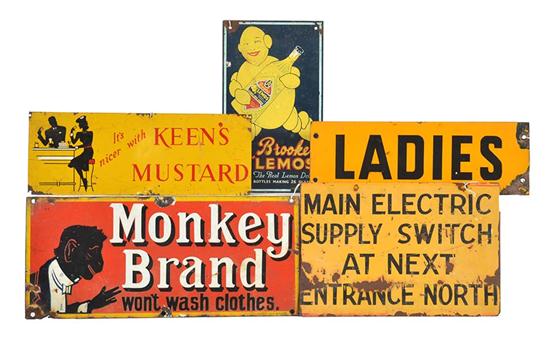 FIVE ADVERTISING SIGNS INCLUDING ENAMEL SIGNS FOR 'MONKEY BRAND' AND 'LADIES', LARGEST 20CM X 46CM (5)