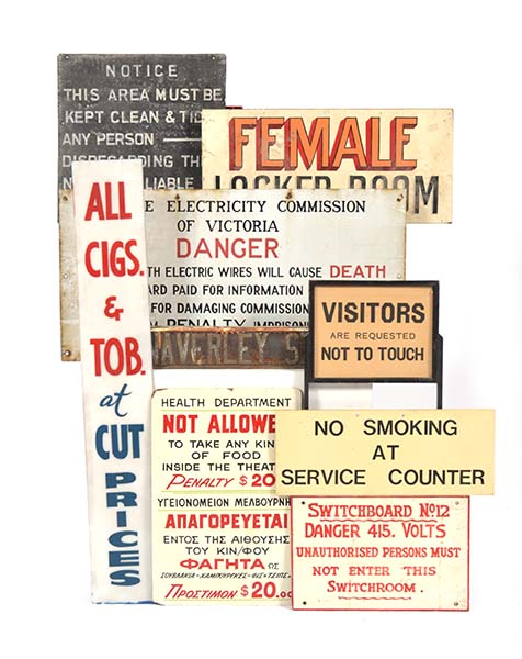 COLLECTION OF WARNINGS SIGNS INCLUDING STATE ELECTRICTY COMMISSION OF VICTORIA ''DANGER'' SIGN, LARGEST 46CM HIGH X 91CM WIDE (A LOT)