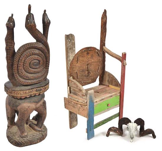 MURRAY WALKER SCULPTURAL ARMCHAIR CONSTRUCTED FROM FOUND OBJECTS, ARMCHAIR 150CM HIGH; SEPIK RIVER CEREMONIAL CHAIR CARVED WITH SNAKES AND FIGURE, 120CM HIGH; AND ONE RAM HEAD SKULL (3)