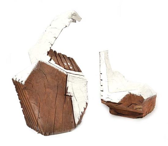'A PAIR OF BIRDS' MURRAY WALKER WOODEN SCULPTURES, MADE FROM RED GUM, LARGEST 93CM X 51CM (2)