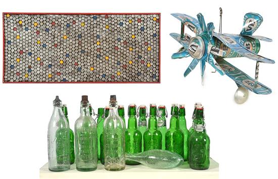 RUSTIC COLLAGE FORMED FROM COLOURED BOTTLE TOPS, FRAMED; AND A COLLECTION OF VINTAGE GLASS BOTTLES, COLLAGE 138CM X 61CM (A LOT)
