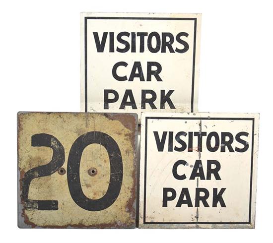 THREE METAL SIGNS, INCLUDING 2 X ''VISITORS CAR PARK'' AND 1 X ''20'', ALL 46CM HIGH X 46CM WIDE (3)